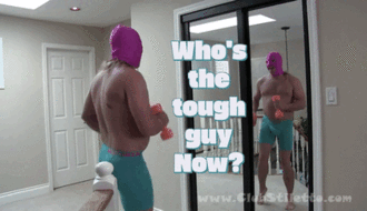 Miss Xi comes out of her home gym and finds a slave in front of the mirror playing macho man with 8 pound weights.  "What the fuck" she says as she goes back into the gym and comes out with a 20 pounder.  She lifts it over her head with one hand then hands it to the slave who struggles to not drop it.  While he holds onto the weight she daftly secures cuffs to his wrists as she is so unimpressed with him she has decided to bust his balls.  She secures him to the stair bannister then brings up one of the 8 pound weights and beats his balls with it.