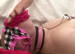 his throat. Goddess Kelli rams the panties in his mouth and using her fingers,